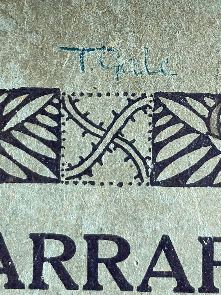 The cover of a Harrap's New World Atlas, which I am judging to be from around the 1930s. It has some pen damage on the cover, and the name of presumably a schoolchild (T Giles) fainlty in biro on the top. Te colour is a faded teal blue, and it has some grime and a lot of signs of use.